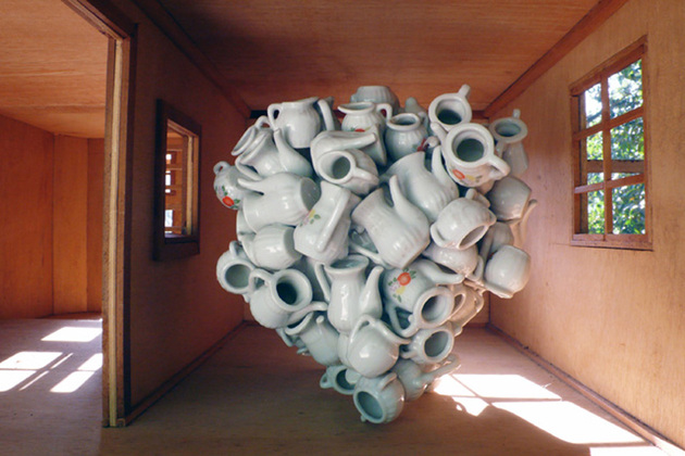 Em uma casa abandonada são encontrados, aparentemente, montanhas de terra, ganchos amedrontadores e inúmeros tonéis coloridos. Porém, um estranhamento se pontua em três momentos, ao menos: quando o objeto central é reconhecido (um punhado de terra, uma coleção de anzóis, tubos de filme fotográfico), quando se percebe que o objeto agigantado está, na verdade, numa casa diminuta e, finalmente, quando esta pequena cena é ampliada a ponto de envolver o observador. O que pode, à primeira vista, parecer lúdico, torna-se taciturno e ambíguo – nesta casa silenciosa há objetos pontiagudos, outros monumentais e pouco convidativos, espaços entregues à penumbra. A artista suscita memórias e sentimentos que não lhe são exclusivos. mas universais, ao apresentar seus objetos de forma lacônica – nada neste trabalho é imperativo.