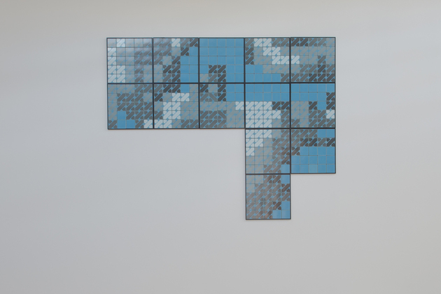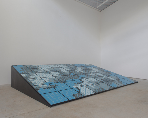 A exploração de modos de codificação de imagens como ferramenta para criação de trabalhos irônicos e lúdicos, que problematizam o status de simulacro conferido à representação na contemporaneidade, tem sido uma constante no trabalho de Regina Silveira. Em sua quinta individual na Luciana Brito Galeria, a imagem de céu azul codificada em ponto cruz – já presente em obras públicas como Tramazul (MASP, 2010) e exposições como El sueño de Mirra y otras constelaciones (Museo Amparo, 2014) – é mobilizada em uma instalação inédita, Dreaming of Blue. Composta por peças modulares de grandes dimensões produzidas em cerâmica, o trabalho dá continuidade à intervenção homônima atualmente apresentada em uma fachada da ilha de Ogijima (Japão) no contexto da Trienal de Setouchi.