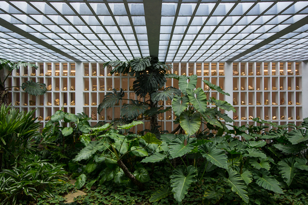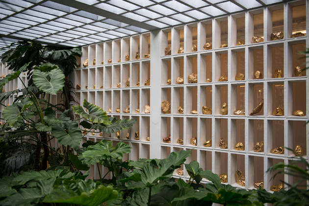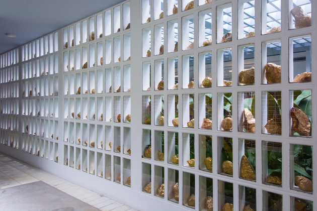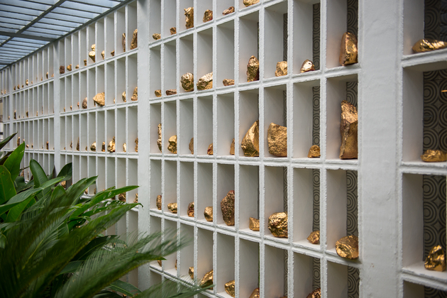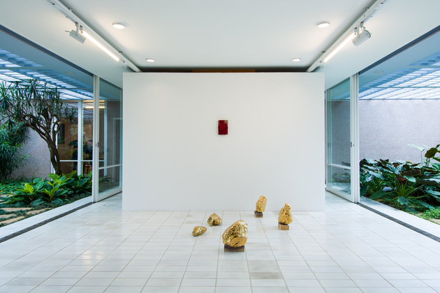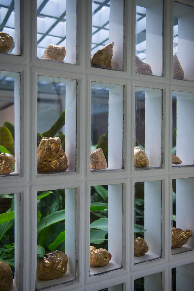 Em Voragine [Voragem], Bosco Sodi apresenta, nos nichos de vidro que delimitam os jardins internos da galeria, uma instalação inédita composta por pequenas pedras vulcânicas extraídas do vulcão Ceboruco no México e banhadas em esmalte cerâmico de ouro. O ouro ganha um sentido polissêmico na obra, aludindo tanto a exploração e destruição que marcaram a historia social desse metal, como sua simbologia relacionada a pureza e a perfeição.