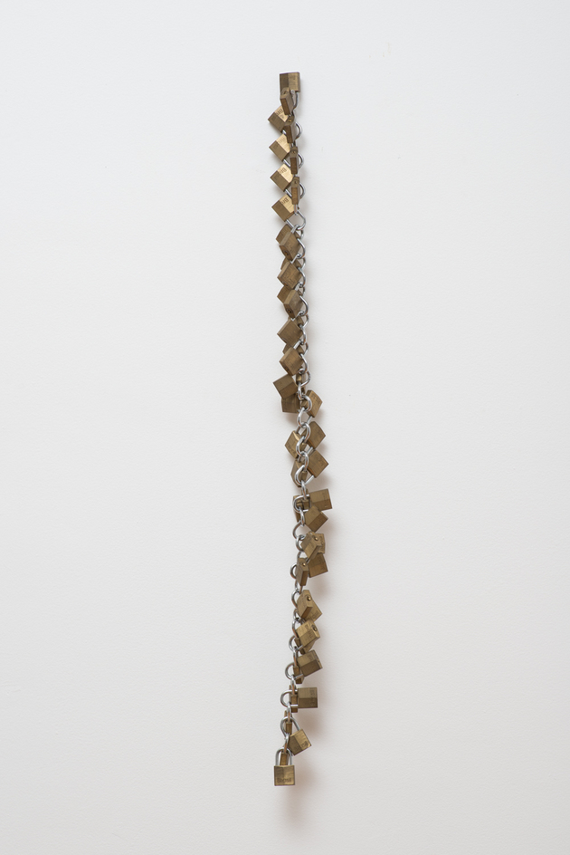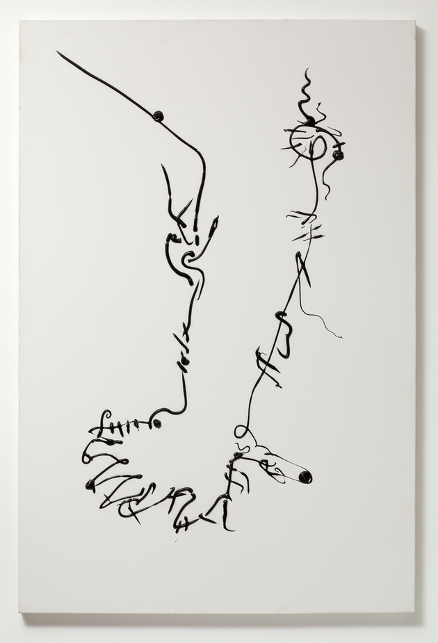 Dezenas de telas em pequenas dimensões apresentam retratos duchampianos, colagens sobre tela de objetos tão díspares quanto fósforos, fios, papel ou vidro, em que o aspecto construtivo e bem-humorado de sua produção é acentuado. Cinco esculturas flutuantes, criadas a partir do acúmulo de elementos como moedas, cadeados ou chaves, compõem retratos e autorretratos tridimensionais e simbólicos. Por fim, cinco pinturas pretas em grandes dimensões, realizadas com a aplicação direta das bisnagas de tinta acrílica sobre a tela, transmitem uma gestualidade rápida e expressiva.