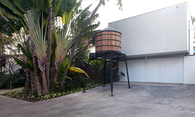 A repetição de padrão pensada para a sala expositiva encontra uma complementação importante na instalação “Water Tower” (2014), posicionada na área externa da galeria. A obra traz a imagem de uma escada sem fim encontrada do recipiente de madeira, teoricamente produzido para a armazenar água. Como parte da série “This Land is Your Land”, a obra convida o público a se posicionar embaixo da caixa d’água e observar o que há dentro dela: um caminho para o infinito.