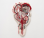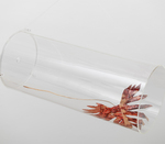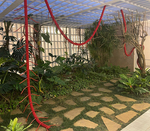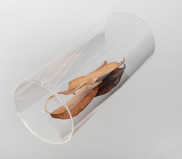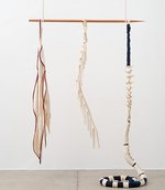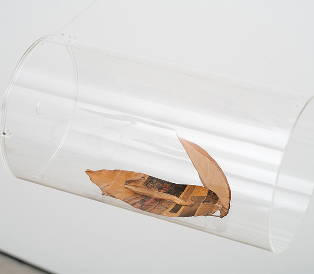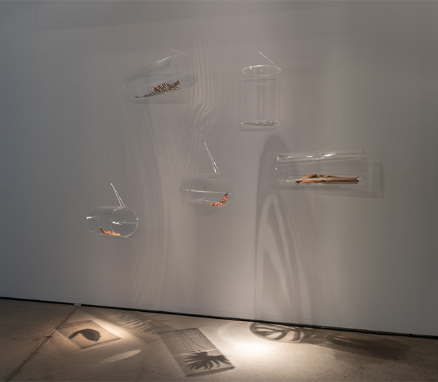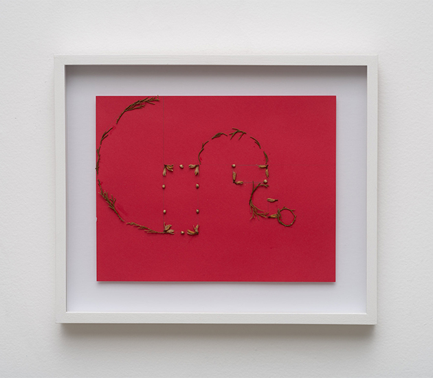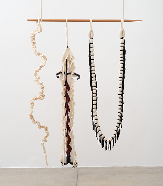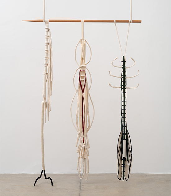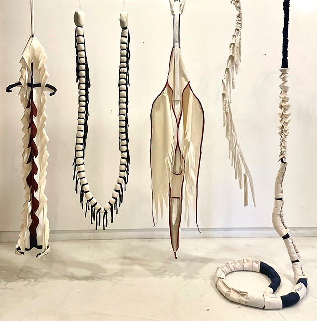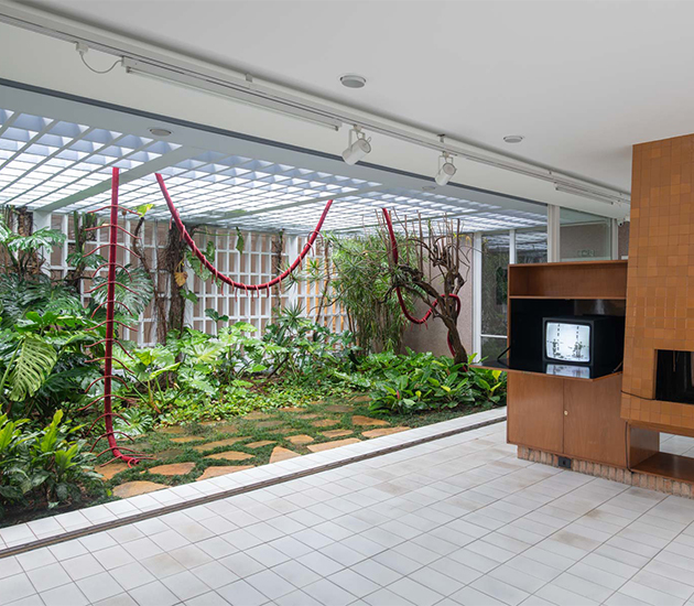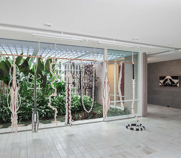 Selva de Carvalho é a terceira “fada” dessa história… todos os trabalhos da artista são inéditos, incluindo a instalação Lacraia é fogo, que remete aos ciclos da vida, pensada especialmente para o jardim de Burle Marx ao centro da galeria, na qual a lacraia feita de tecido e cerâmica perpassa por plantas e pelo teto ao longo do espaço, num dialogo direto com a arquitetura e a natureza do local. No salão de entrada vemos Medula de Medusa, uma sequencia de esculturas em tecido com desenhos e bordados, atravessadas por um filamento de madeira em suspensão, fixado no teto, formando uma instalação de corpos flutuantes. A “medula espinhal” simboliza a resistência, as adaptações e metamorfoses dos corpos na natureza. No jardim dos fundos, entre a casa e o pavilhão, um outro conjunto de esculturas da artista permeia o solo: Éramos palmeira é formado por seis corpos de folhas de palmeiras e tecidos de algodão fincados diretamente na terra, uma instalação que contrapõe Medula de Medusa em sua apresentação não linear e fixação terrestre. Por ultimo a obra Corpo Chora Coral, um coral feito em tecido com papeis, bordados e desenhos, na parede oposta ao “coração luminoso” de bianca turner, estabelecendo um dialogo entre o órgão vital e o organismo essencial para a vida marinha.