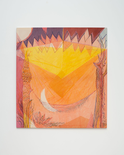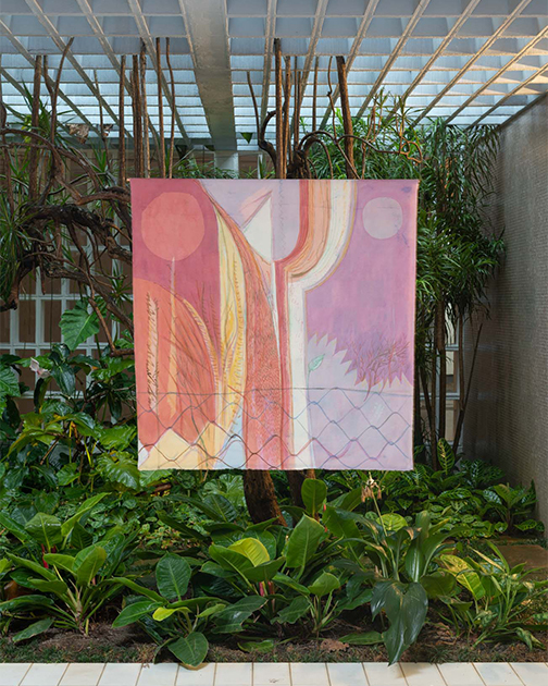 “Pince-nez” reúne ainda um conjunto de cinco pinturas de menor dimensão inéditas, que ao mesmo estilo da instalação, receberam camadas bem aquosas de tinta acrílica. O imaginário das pinturas da grande instalação da tenda é complementado com as paisagens naturais da série “Rede” (2022), mito-paisagens com redes esticadas entre árvores.