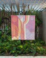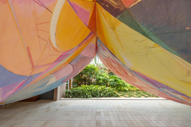 Por sua transparência e movimento, o longo tecido que paira sobre as cabeças logo convida os visitantes a uma interação com os jardins de Burle Marx. Com quase dez metros de comprimento, a peça foi toda pintada e costurada a mão por André Sousa, em seu estúdio em Portugal: elementos abstratos e figurativos, que convivem em harmonia e atravessam os conceitos abordados por sua pesquisa, como símbolos geométricos, objetos diversos (tabuleiros de xadrez), paisagens e elementos naturais (floresta, cascata e o fogo).