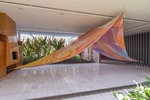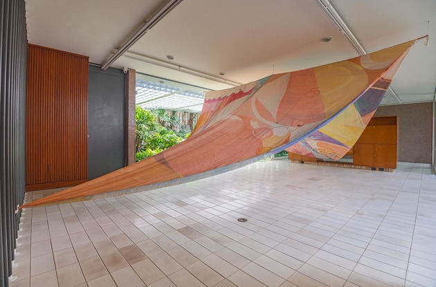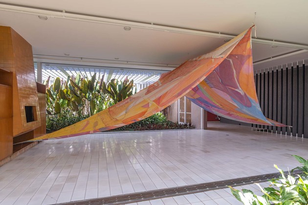 Ao adentrar a Sala Modernista, o visitante logo se vê envolvido em uma grande tenda de tecido, presa a partir dos dois lados opostos e erguida pelo seu centro. Num primeiro momento, o material leve de algodão 100% contrasta com a arquitetura robusta e formalista do projeto de Rino Levi. A estrutura funcional da tenda (abrigo e proteção) toma o lugar da edificação Modernista da casa, devolvendo o jardim à floresta e fazendo da lareira, uma fogueira a céu aberto, ou mesmo aludindo ao forno comunitário.
