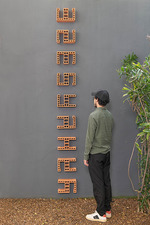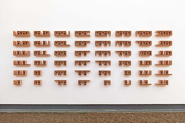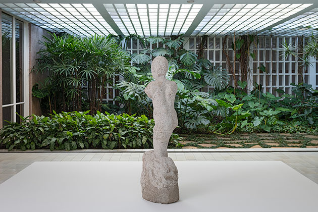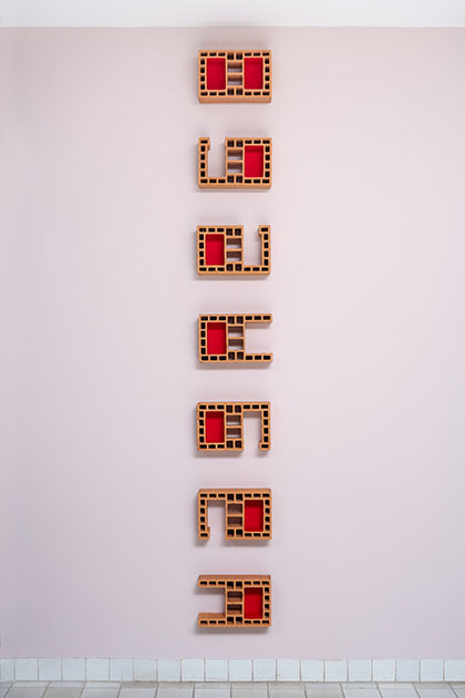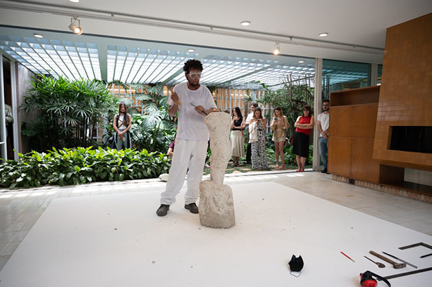 A obra Platônicos, realizada pela primeira vez em 2017 em Ponte Vedra, Espanha e, agora, na sala de estar da Residência Castor Delgado Perez, hoje ocupada pela Luciana Brito Galeria, parte da iconografia clássica masculina, representada numa escultura de pedra, que deverá ser modificada por meio da ação de um profissional da cantaria. Torso nu, músculos tensionados, sexo exposto, semblante sério e olhar foca-do são características recorrentes da representação do homem na cultura ocidental, desde a antiguidade clássica. David (1501-1504), escultura realizada por Michelangelo no período renascentista, talvez seja o mais emblemático exemplo de tal iconografia. Mas a importância dessa escultura não reside apenas na perfeição de sua forma. O herói bíblico é também símbolo de um projeto civilizatório baseado no raciona-lismo e na virilidade, e que nos orienta – e oprime – até os dias de hoje.