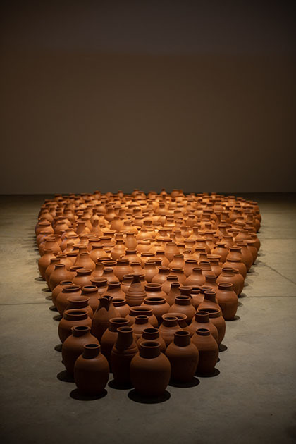 Por sua vez, Movimentos emissores da existência se inicia com uma ação em que um grupo de mulheres caminha sobre vasos de barro fresco. A performance, em sua quarta edição, ocorrerá no galpão anexo à casa, e foi realizada anteriormente em 2019 na Cidade do México e em Otazu, Espanha, e em 2020 em Dhaka, Bangladesh. Para a criação dessa obra, Zamora parte da imagem icônica de uma mulher carregan-do, sobre a cabeça, um jarro de cerâmica portando água. O hábito de mulheres carregarem grandes volu-mes de carga sobre a cabeça está presente nas mais diferentes culturas, da matriz ocidental greco-romana a outras culturas presentes na Ásia, Índia, África e Américas, incluindo-se, por óbvio, o Brasil. Para realizar a operação de carregar um peso por vezes quase equivalente à sua própria massa corporal, são necessá-rias, além de força e destreza, também alguma sutileza. Afinal, movimentos bruscos não combinam com equilíbrio. O imaginário ocidental, infelizmente, acabou associando essa imagem à de uma mulher utilitária e altiva, porém dócil. A prova disso são as lições de etiqueta de tempos nem tão remotos assim, em que meninas de classe média alta eram estimuladas a carregarem objetos sobre a cabeça, como forma de exercitarem uma postura ereta e comedida. Difícil não associar tal imagem a toda sorte de regimes discipli-nares a que a mulher é submetida, desde os tempos mais remotos até os de hoje. Para lembrar de um dizer relativamente recente: bela, recatada e do lar.