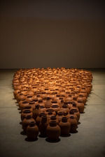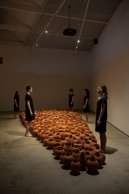 Ao convidar as mulheres a pisarem sobre os vasos, Zamora propõe um interessante jogo com tal icono-grafia, intervertendo, literal e metaforicamente, o seu sentido. O ato de tirar o vaso do alto da cabeça e passá-lo ao chão, para, a seguir, pisá-lo com os pés, pode ser lido com um gesto de recusa à condição utilitária e submissa que foi relegada à mulher no curso da história ocidental. No entanto, ao serem utiliza-das peças de barro fresco, e, portanto, maleáveis, o que acontece ali não é um gesto de destruição, mas sim de transformação. Uma vez pressionados com os pés, em uma combinação de força, precisão e suti-leza (as mesmas habilidades, portanto, requeridas para que os vasos sejam mantidos sobre a cabeça), o que antes eram objetos utilitários se tornam um elemento escultórico provocador, que nos lembra uma forma uterina, vaginal. Impossível não enxergar a surpreendente capacidade de transmutação empreendida por esse grupo de mulheres como uma metáfora do dia a dia feminino.