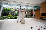 No entanto, apesar da beleza poética da encomenda do artista e do profissionalismo do executor, a ação está, desde o início, fadada ao fracasso. Uma vez esculpida pela primeira vez, a pedra se torna molecu-larmente mais instável, o que dificulta significativamente a possibilidade de reesculpi-la com a precisão requerida para a criação das formas platônicas. Assim, por maior que seja a competência do canteiro, o que restará da escultura após um árduo e ruidoso processo serão, em sua maioria, cacos de pedra dis-formes, espalhados desajeitadamente pelo ambiente modernista da casa. Neste cenário, fica evidente um certo descompasso entre a premissa idealista e o resultado algo catastrófico. Com isso, Zamora nos pro-voca, entre outros, a pensar sobre a distância entre teoria e prática com que estamos acostumados a con-viver no dia a dia e que, apesar de fazer parte de um anedotário coletivo popular, tem bases filosóficas bastante sólidas, ancoradas nessa mesma cultura greco-romana, fundamentalmente androcêntrica, ao redor da qual a obra orbita.