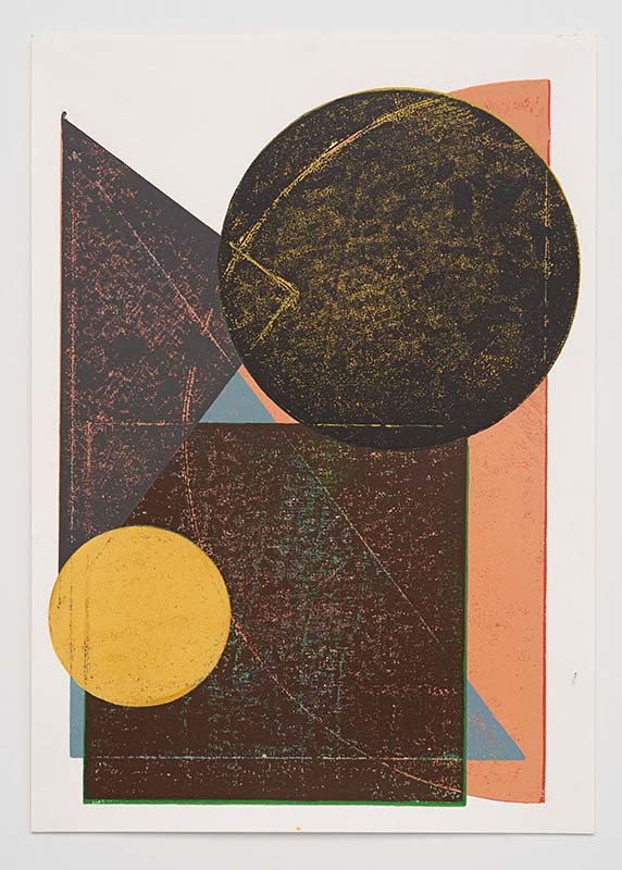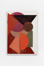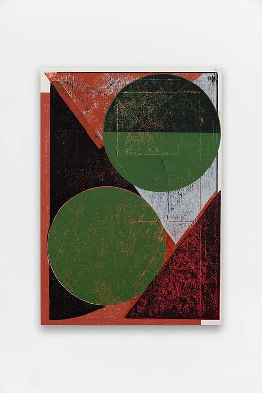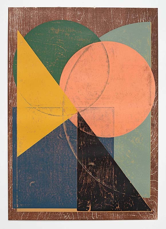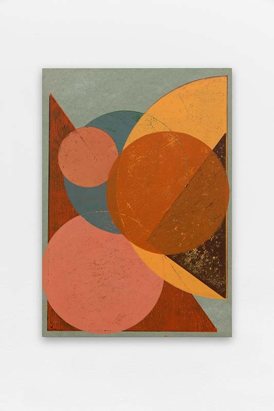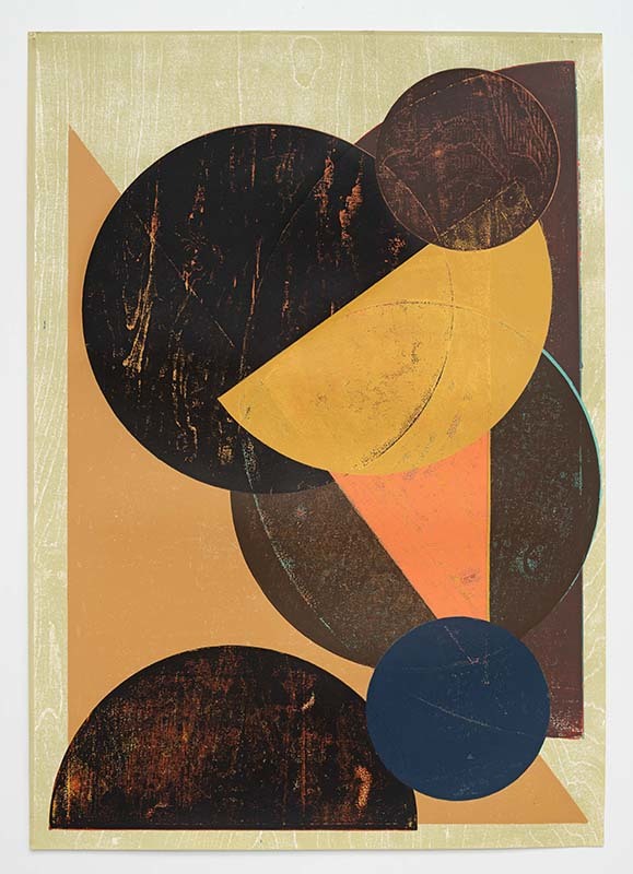 Essa grande pesquisa norteia a série de trabalhos que dá nome à exposição, Gnomonic Woods (2025). Embora inspiradas no vocabulário esotérico que compõe os relógios de sol (círculos, semi-circulos, corações, triângulos, cruzes, trapézios etc), essas xilogravuras trazem a espontaneidade do momento da produção em estúdio e revelam os cerne da prática escultórica do artista, que traz os sistemas combinatórios agora aplicados à linguagem pictórica. Essa é a primeira vez que ele trabalha sem planejamento, seguindo um protocolo que permite o acaso tanto na sobreposição de cores, quanto na desconstrução dos elementos do relógio do sol, diversificando as formas. Tecnicamente, a prática é similar à da xilografia, onde ele cobre com tinta os pedaços de madeira recortados em triângulos, círculos, quadrados etc, e aplica no papel. Uma vez pronta a composição, o artista fixa o papel em uma placa de madeira, elemento recorrente na sua prática e que também surge como uma maneira de experimentar sobreposições de formas e cores. Essas camadas de processo tornam cada trabalho único.