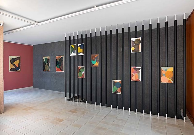 Já na parede principal da Sala Modernista da galeria, o artista apresenta uma pintura de parede projetada exclusivamente para a exposição. Pensada para representar a localização da cidade de São Paulo, a pintura traz linhas transversais que não apenas representam a latitude da cidade, como também fazem uma alusão aos ponteiros, que nos relógios de sol são chamados de gnomon, ou ponteiros de sombra. Na pintura, as tonalidades das cores pasteis remetem ao degradê das sombras, interrompidas por duas pinturas menores que retratam os relógios de sol, produzidas por machetaria, tinta e gesso. Os processos de criação envolvem um estudo profundo de outras gravuras ou objetos, projeção da versão 3D e finalizando com a renderização axonométrica. A machetaria, técnica artesanal que consiste em incrustar pequenas peças de madeira, remete à técnica utilizada pelo artista na combinação das peças de madeira da série Prismatiques.