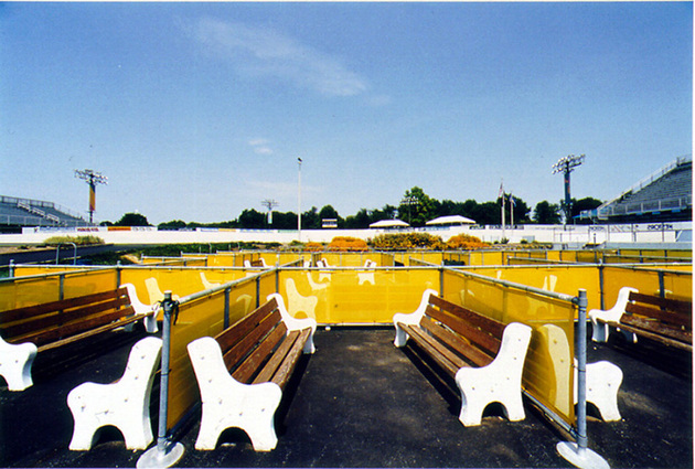 Curiosamente, intrínseca a esta paisagem, estende-se um velódromo que, para receber os usuários -que treinam e competem no local - possui toda uma estrutura montada: são bancos, arquibancadas, mastros com bandeiras americanas e os anúncios de empresas e os seus logotipos. Agora temos um local de passagem, onde as pessoas transitam com um determinado fim e logo vão embora. Nestas fotografias, a construção permanente, organizada, árida e vazia do espaço, nos é mostrada pelo artista com toda a força e grandiosidade de suas estruturas. Encontramos um espaço tão assumidamente fixo para um trânsito por vezes tão escasso e esporádico de pessoas.